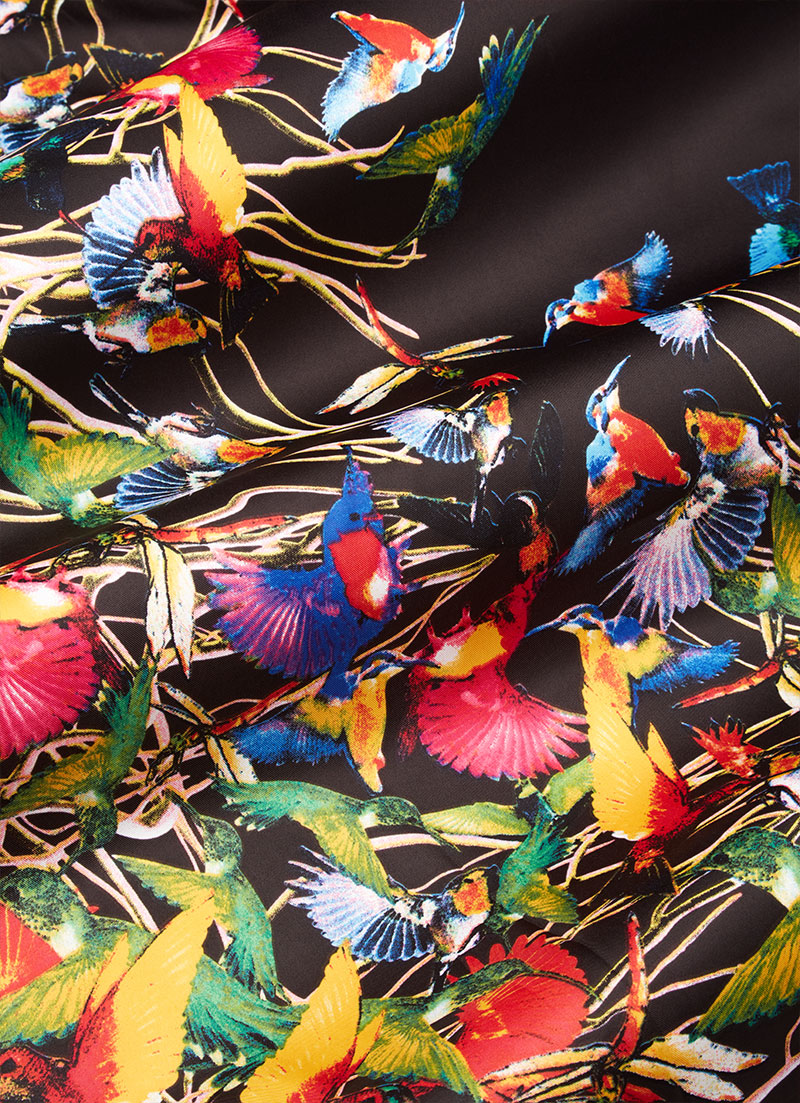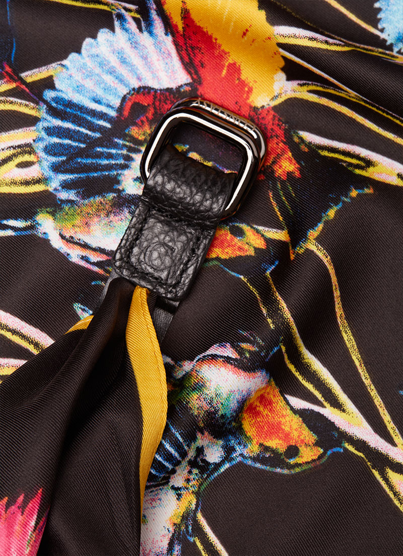 Introducing the Avian Kaleidoscope Silk Scarf, a vibrant celebration of avian beauty and color. Crafted from luxurious silk, this scarf features a mesmerizing print inspired by the intricate patterns and vibrant plumage of exotic birds. Adding to its allure, the Avian Kaleidoscope Silk Scarf is adorned with a leather ending, offering both elegance and functionality. This unique detail allows for versatile styling options, whether draped around your neck, tied as a headscarf, or worn as a chic belt, allowing you to express your style with effortless sophistication. The possibilities are as endless as your imagination.