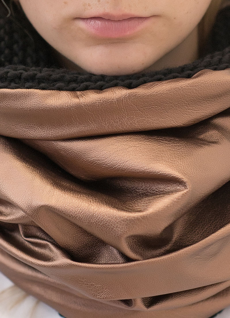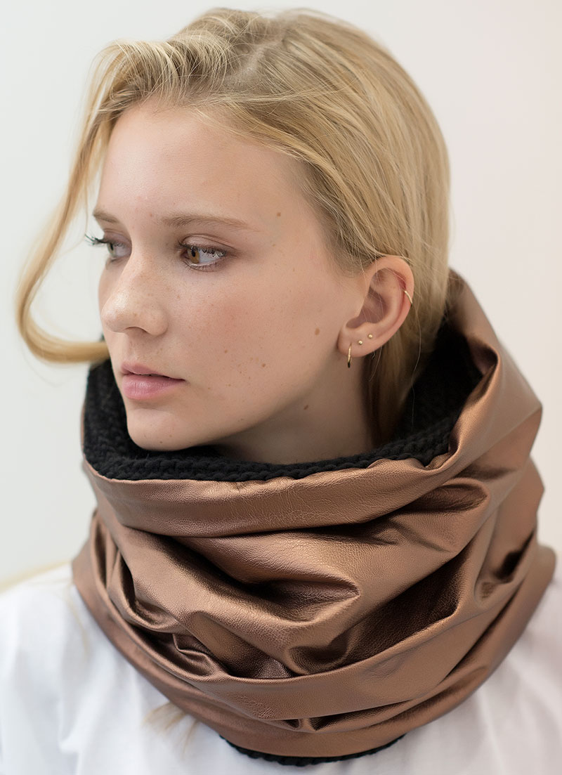 Elevate your winter style with our Bronze Sheepskin Prestige Snood. This uniquely crafted double-sided snood features a luxurious bronze sheepskin eco leather exterior that exudes sophistication and prestige. The interior is lined with cozy black wool for ultimate comfort. It’s a must-have addition to your cold-weather collection.