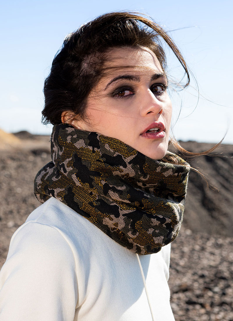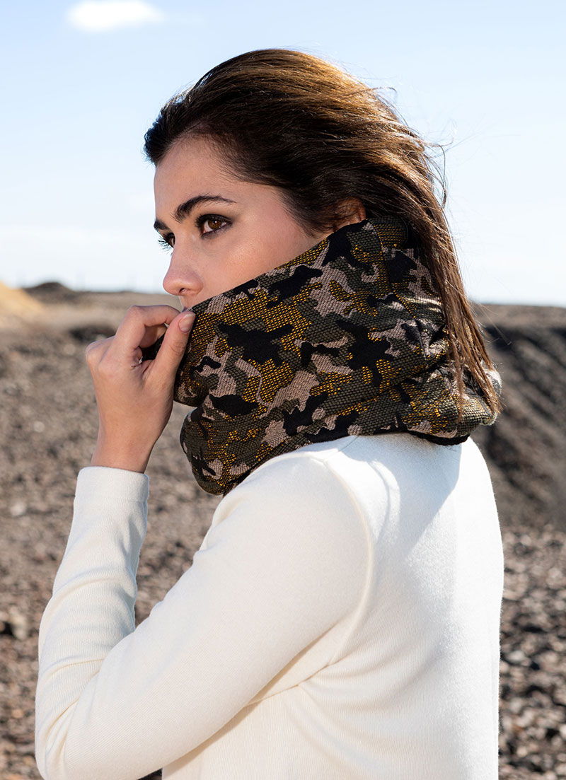 Elevate your winter style with our Camouflage Glam Army Snood. This uniquely crafted double-sided snood features a captivating Lurex camouflage pattern that shines with a touch of glam, exuding a sense of alluring mystique. The interior is lined with cozy black wool for ultimate comfort, ensuring that you’re ready to conquer the coldest of days.
