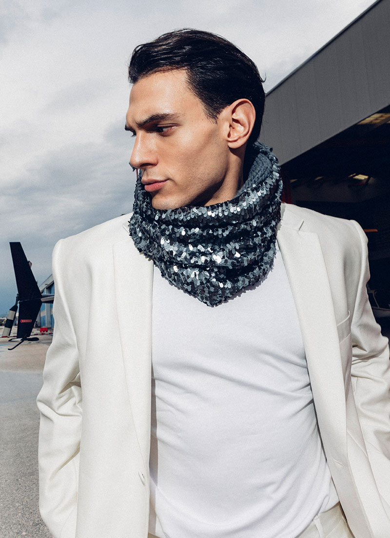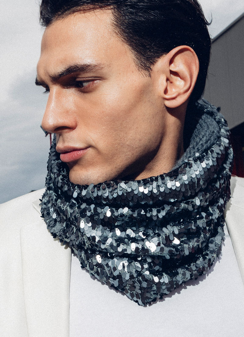 Add an edgy, modern touch to your wardrobe with the Gray Metallic Snood. One side features a sleek gray metallic finish, offering a subtle shimmer that enhances any outfit with contemporary flair. The reverse side boasts a soft, knitted texture, perfect for staying cozy during chilly days.