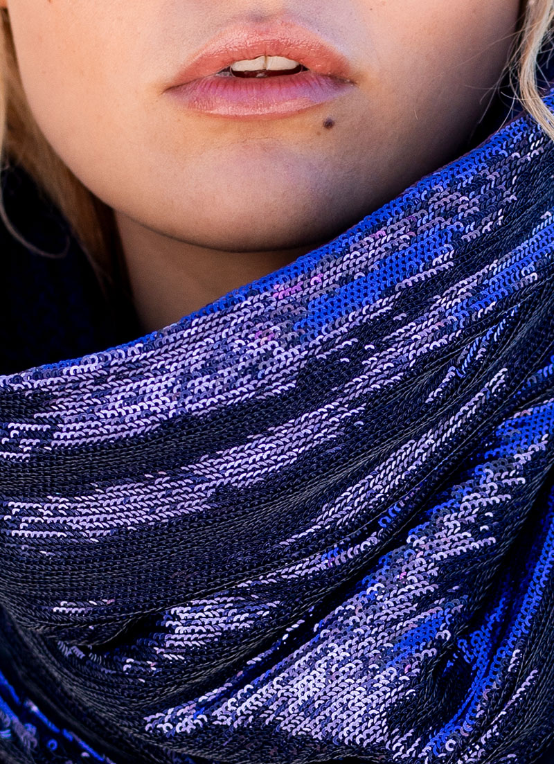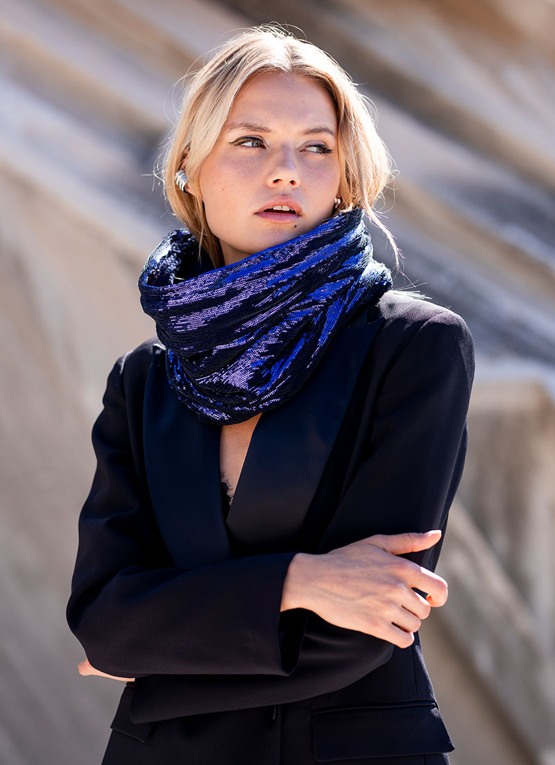 Elevate your winter style with our Royal Blue & Black Sequin Snood. This uniquely crafted double-sided snood features royal blue and black shiny double-sided sequins on one side for a touch of sophistication, and the inside is lined with cozy blue wool for ultimate comfort. It’s a must-have addition to your cold-weather collection.