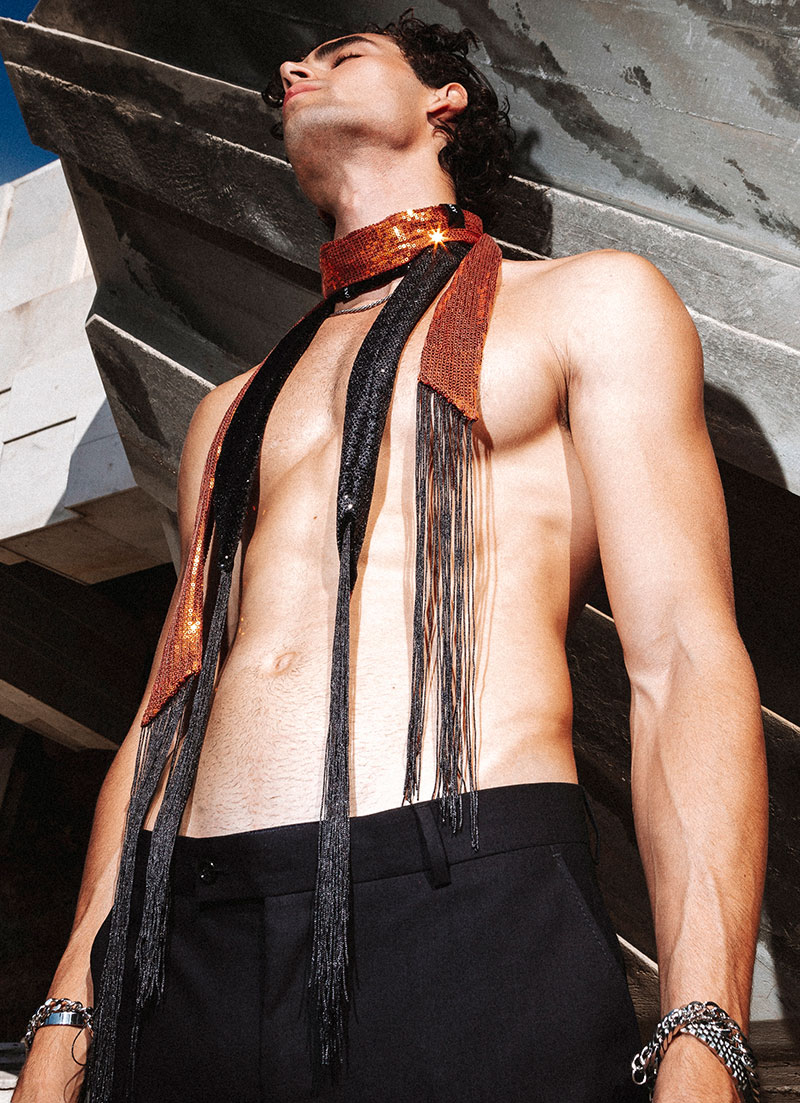 The delicate twill fabric provides the canvas for these exquisite sequins to shine upon, while the black fringes add an enchanting finish that complements the overall design. Whether you choose to drape it as a scarf, cinch it as a belt, or knot it as a tie, the “Royal Bronze Sequin Whirlwind” is your path to an elevated and distinguished style.