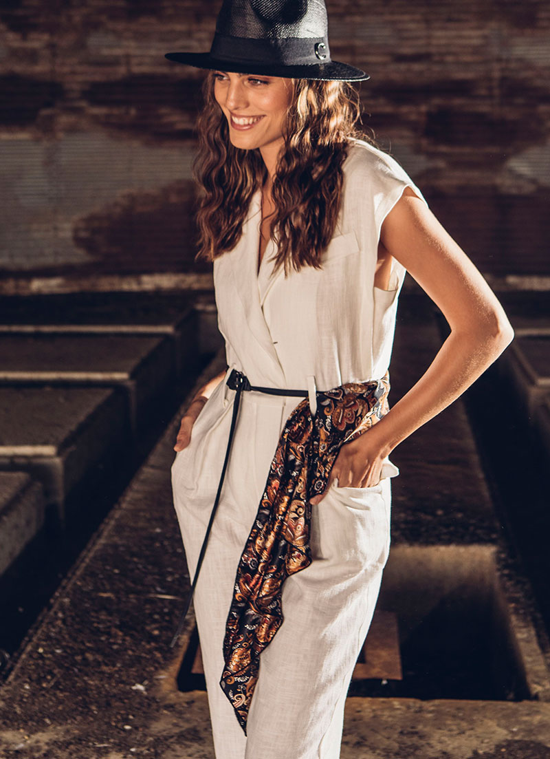 A silk belt scarf combined with leather. Wear it like a belt, a scarf or like a top! The CONSTASY statement for every look!