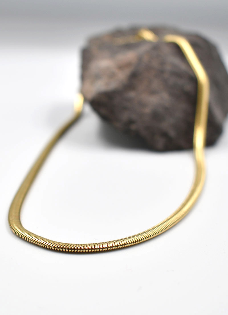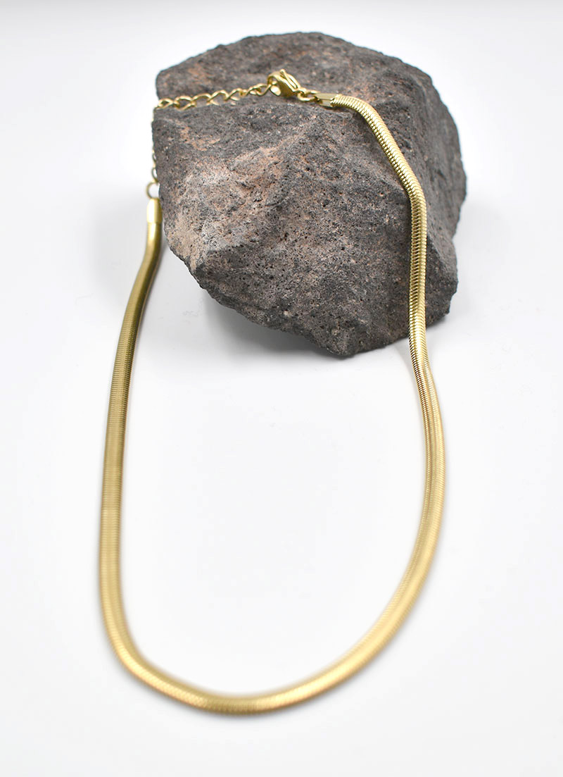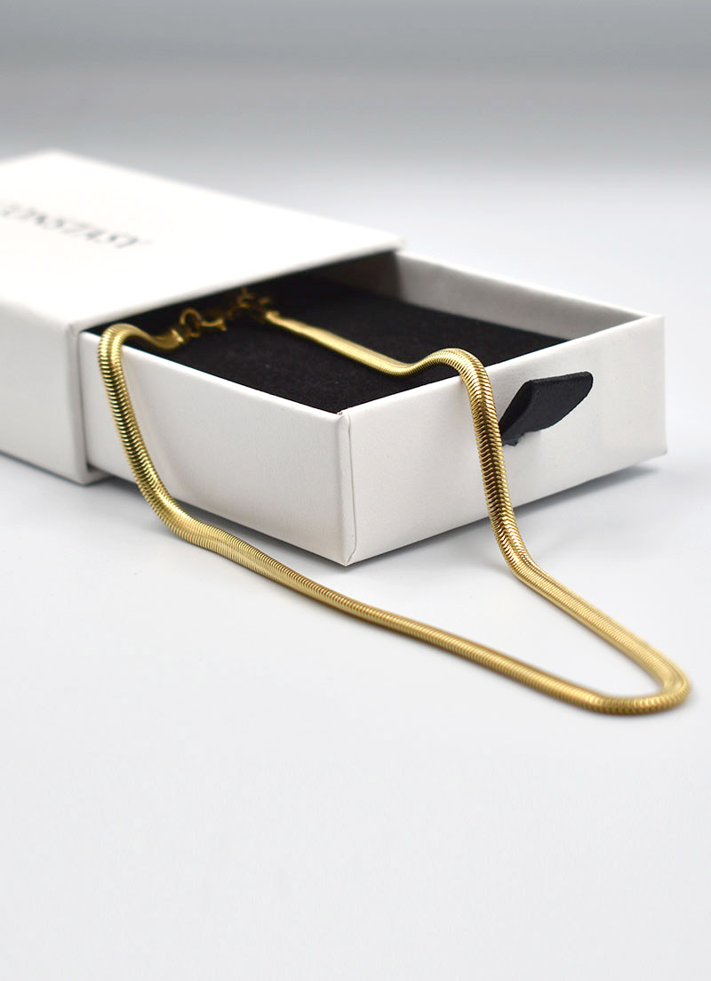 The CONSTASY snake chain is one of our smoothest chains, but definitely a statement piece. Made with a 5mm herringbone pattern, it got a soft feeling and lays comfortably against your skin. The chain is adjustable 40-45cm.