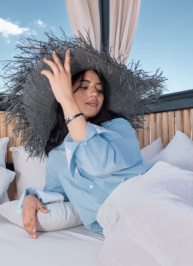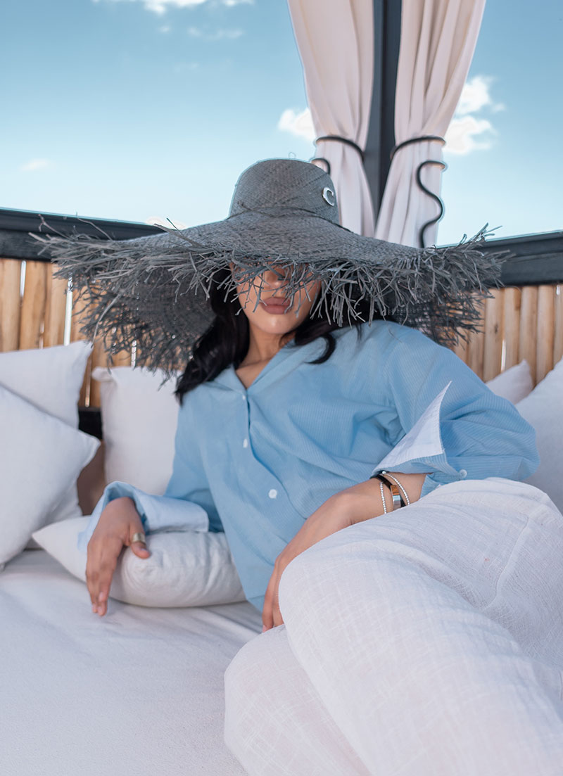 The cool gray shade offers a refreshing alternative to neutrals, effortlessly elevating beachwear, resort looks, or city strolls. Lightweight, breathable, and beautifully detailed, it’s the perfect piece to wear from sunrise to golden hour.