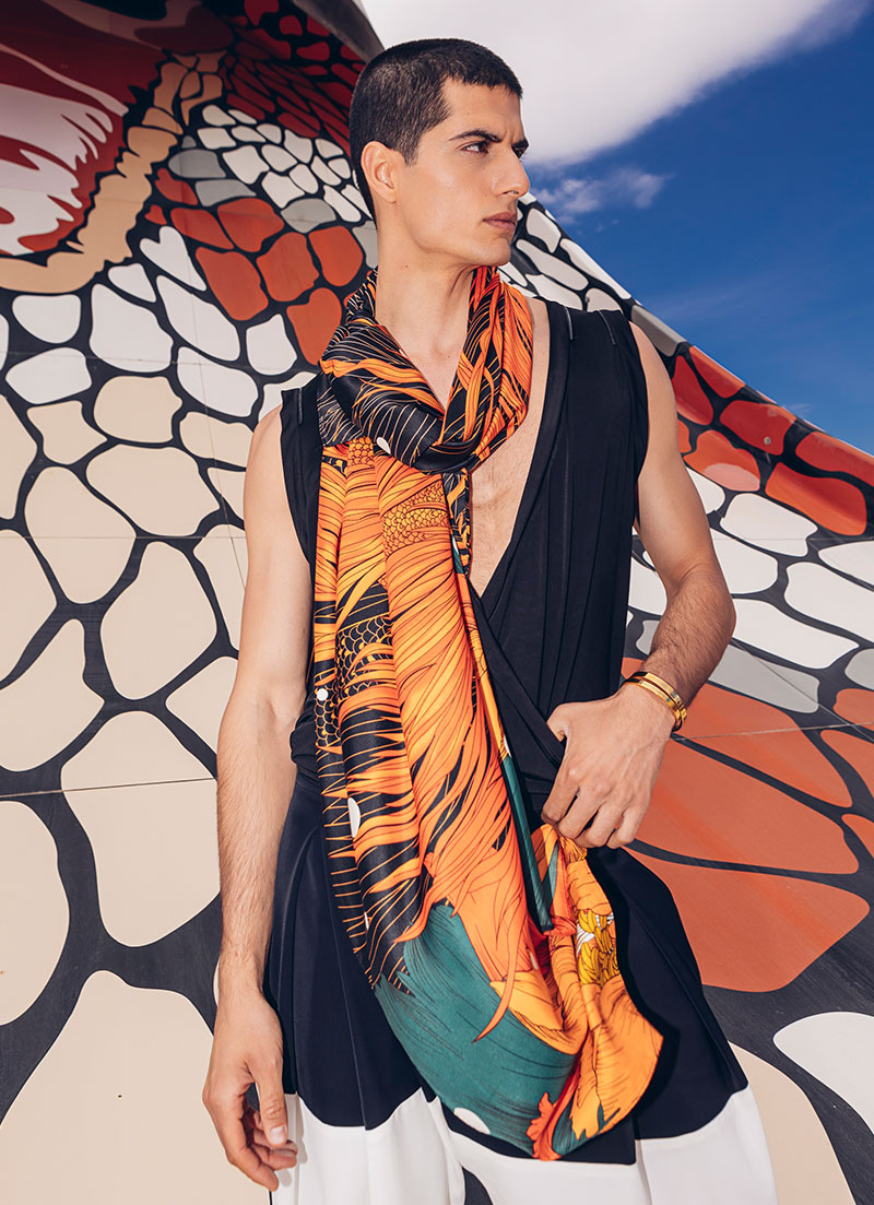 Measuring a generous 130 x 130cm, the Whispers of the Deep Silk Scarf invites you to explore the depths of your imagination. Let its exquisite craftsmanship and captivating print, complemented by the unique leather ending, be the perfect accessory to infuse your wardrobe with oceanic elegance and allure.