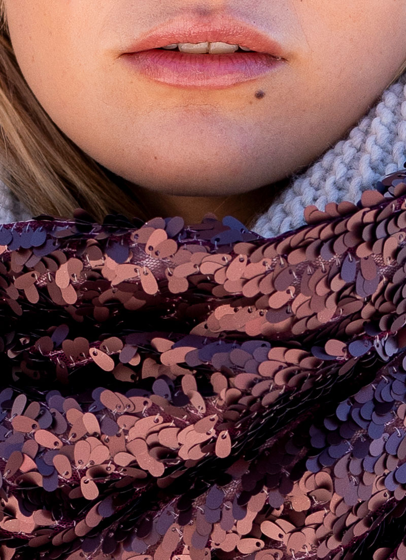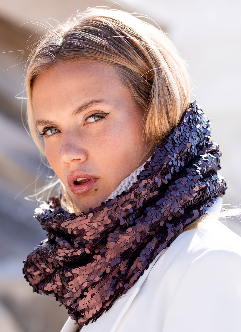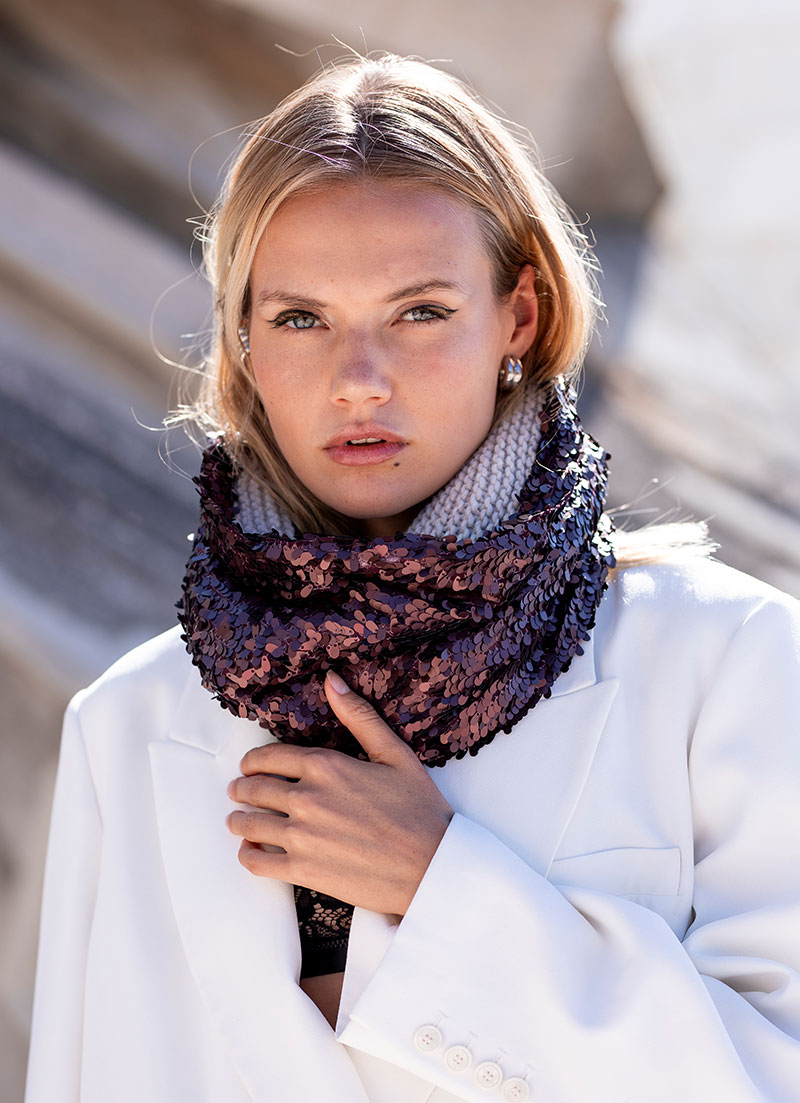 Elevate your winter style with our Wine Metallic Snood. This uniquely crafted double-sided snood features wine-colored metal details on one side, exuding a touch of sophistication and luxury. On the reverse side, you’ll find cozy nude wool for ultimate comfort. It’s a must-have addition to your cold-weather collection.